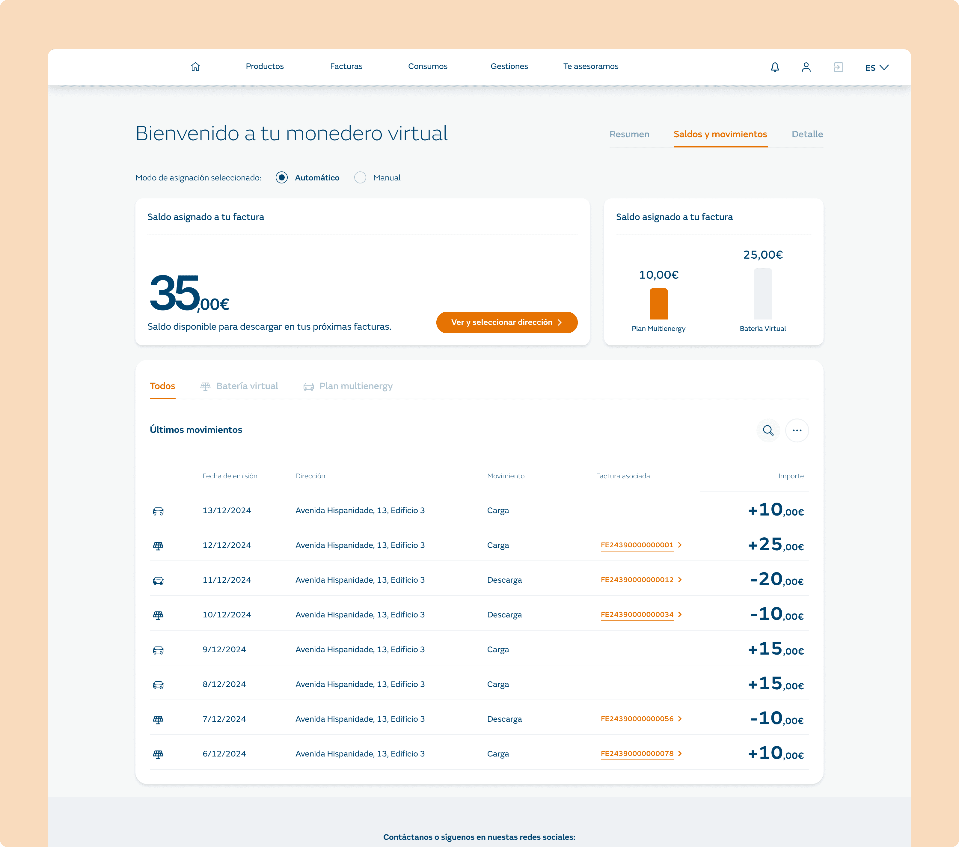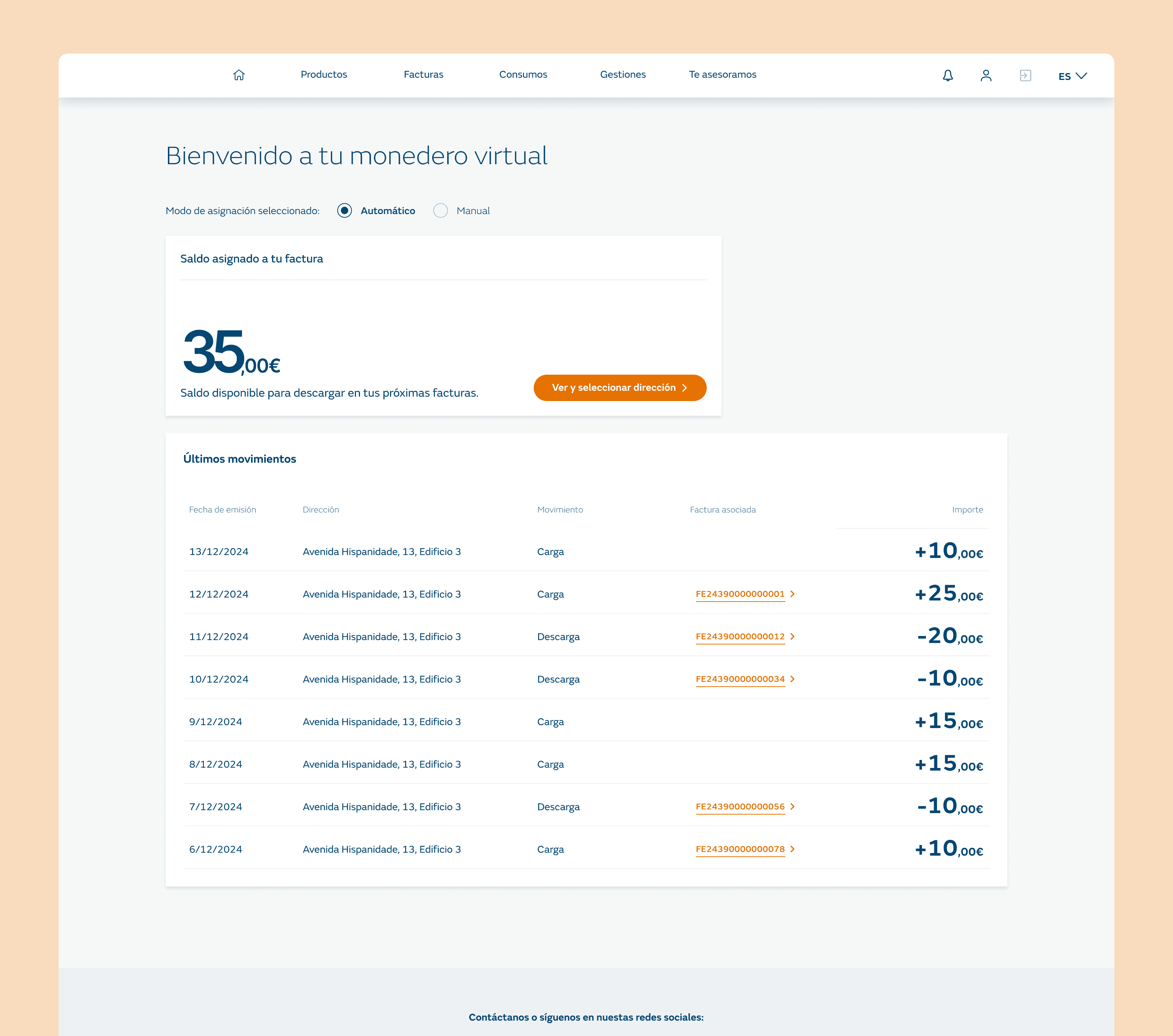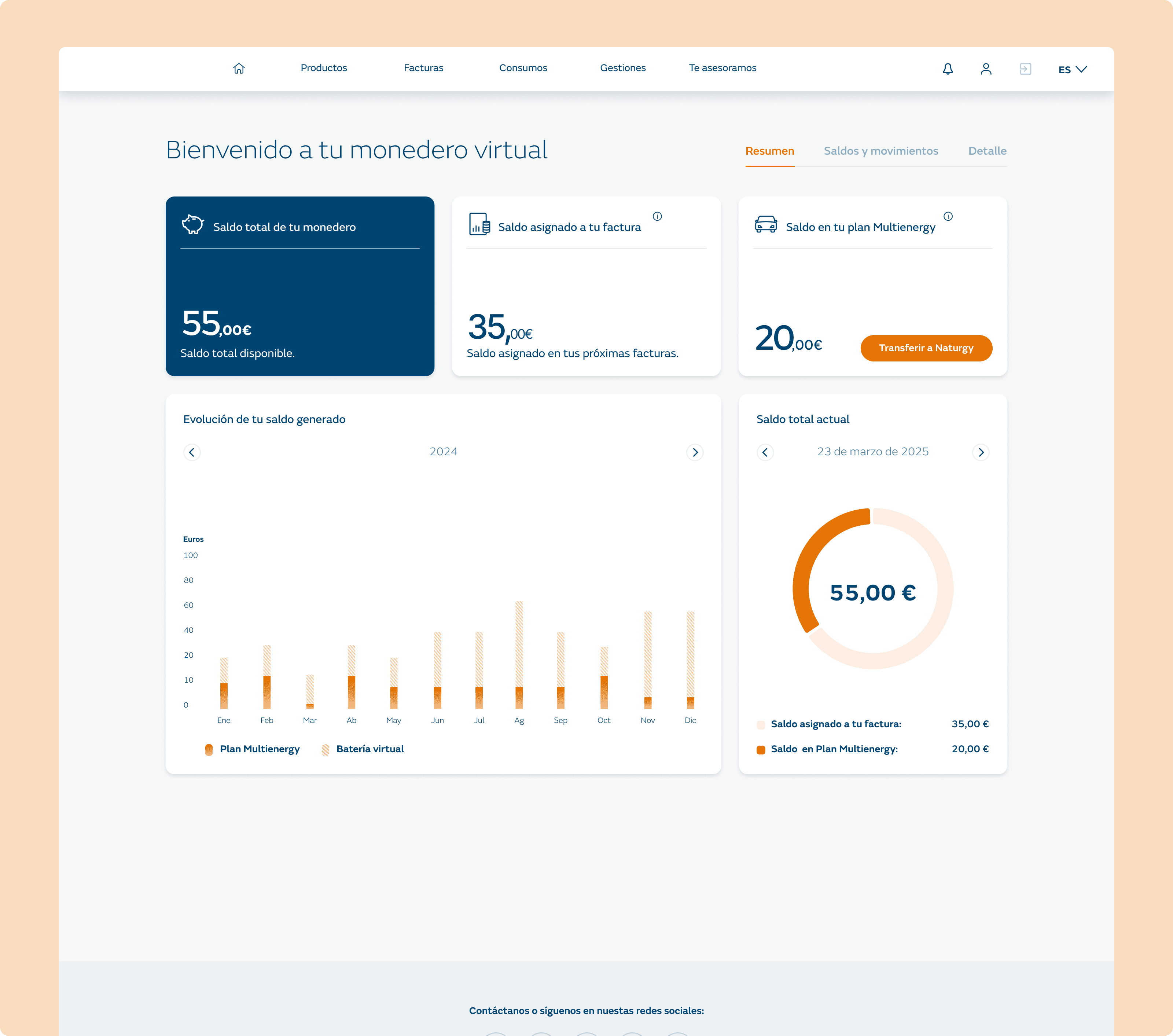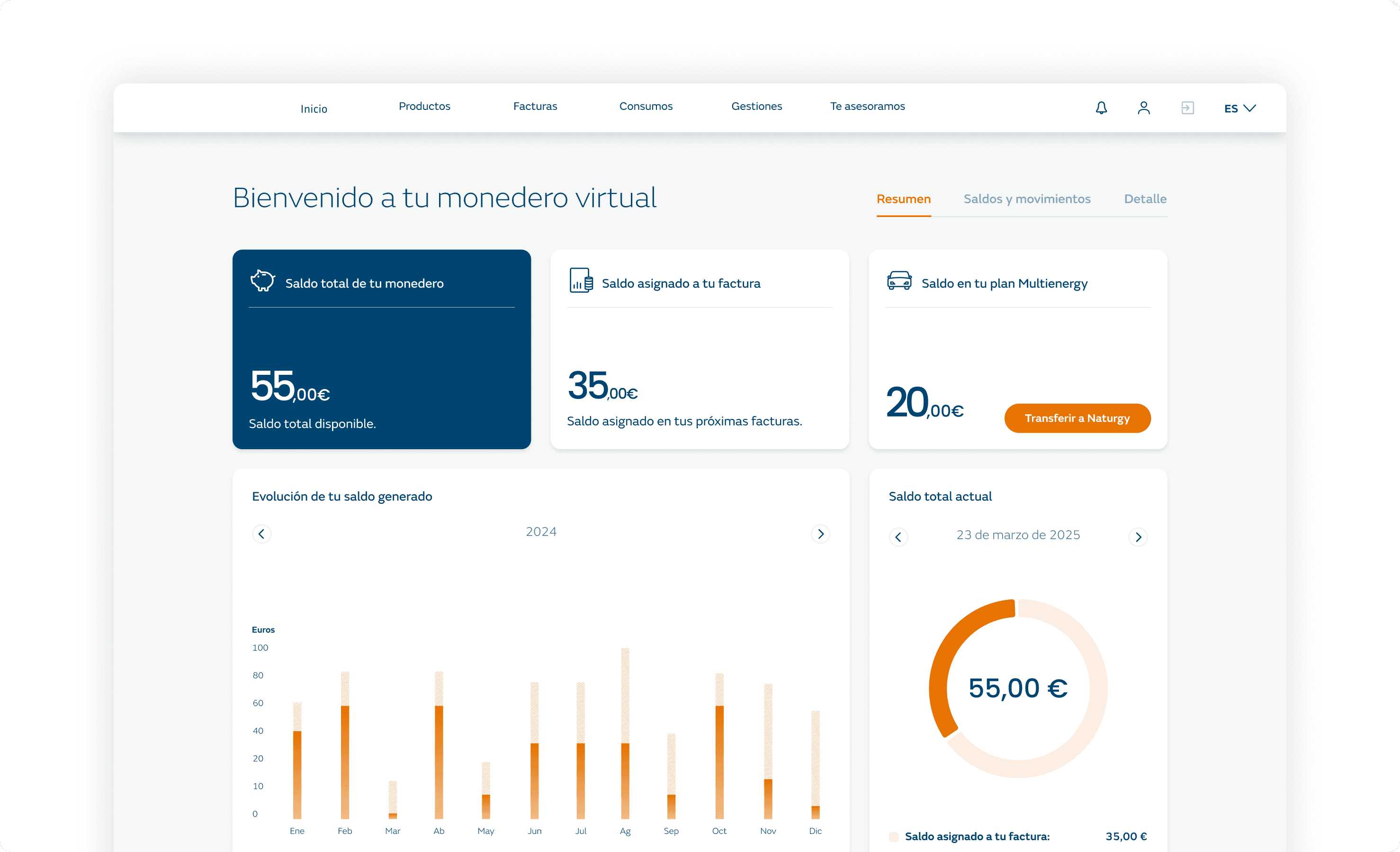 El Monedero Virtual es una de las funcionalidades clave dentro del ecosistema digital de Naturgy. Permite a los clientes acumular saldo generado por diferentes productos de la compañía y canjearlo directamente en sus facturas de luz, creando un incentivo tangible para la fidelización.