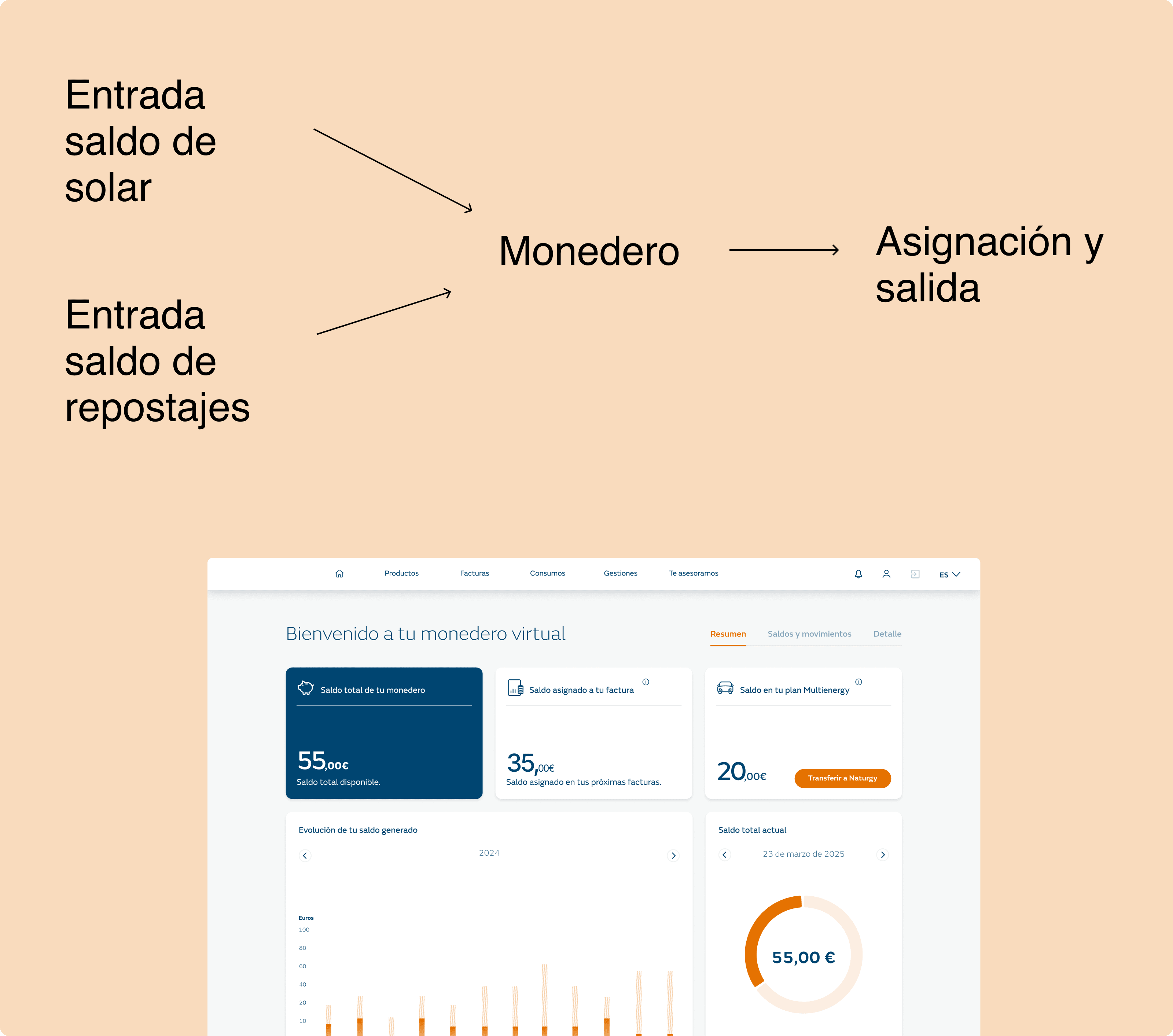 Naturgy contaba con un monedero digital básico vinculado exclusivamente a la generación de energía solar. Los usuarios podían acumular saldo, pero la funcionalidad era limitada y poco visible dentro de la app.