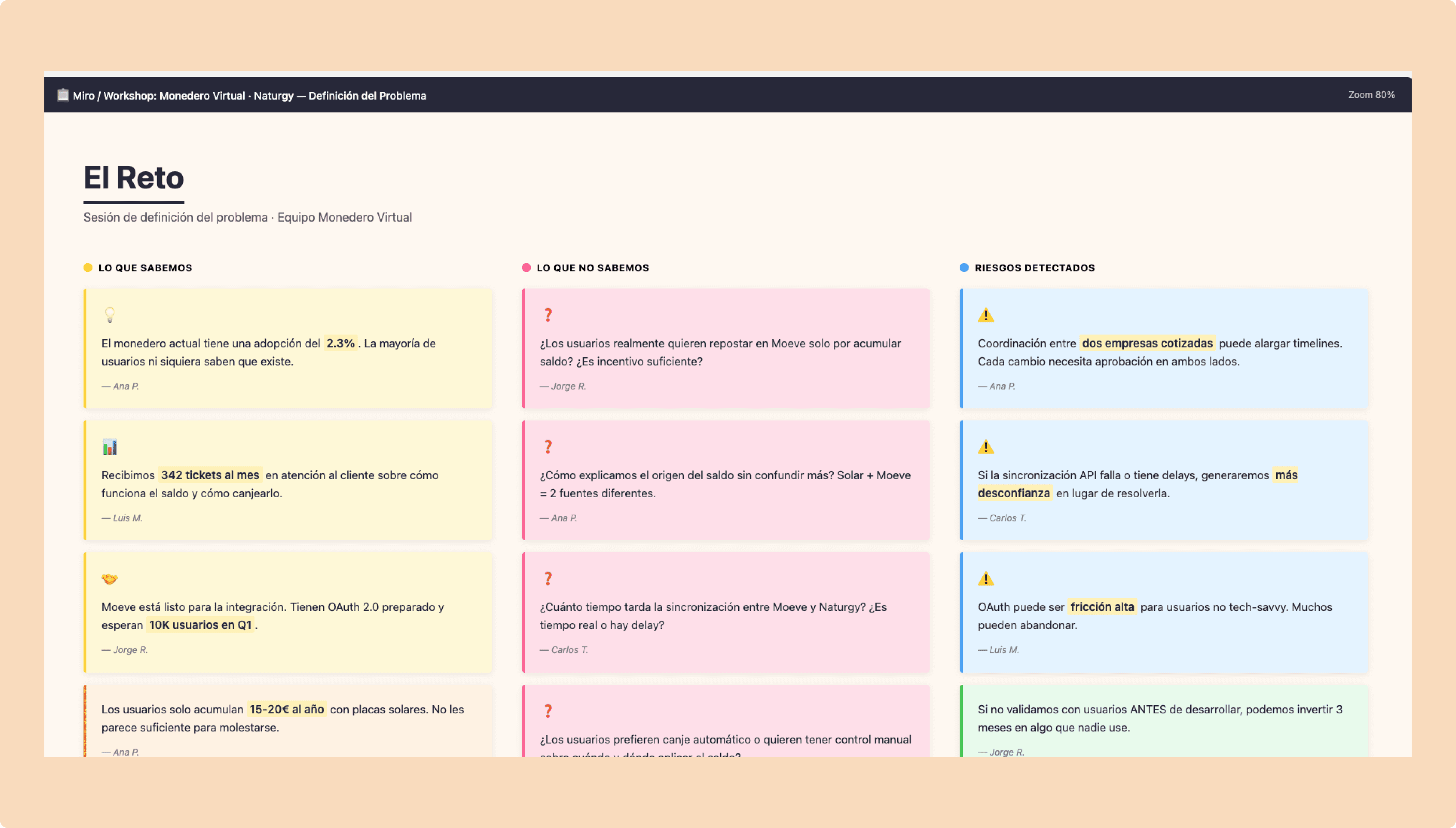 El proyecto involucro equipos de dos grandes empresas con múltiples niveles de management, y cada workshop de alineación solía general nuevos cambios, por lo que aprendí a consolidar feedback en ventanas definidas en lugar de ajustes continuos que alargaban el proceso y no añadían valor real.
